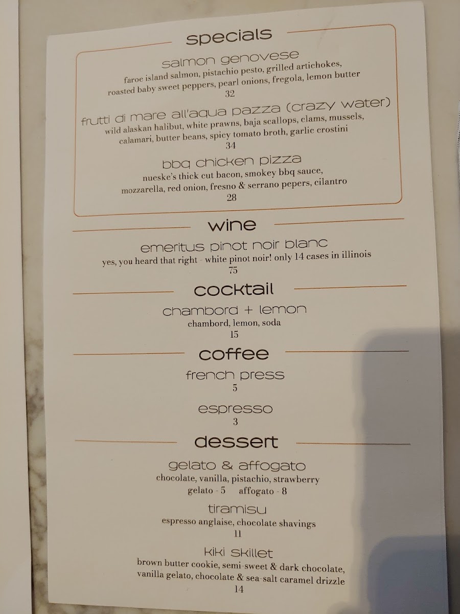 The menu also features a range of salads and small plates, including fresh Imported Burrata and the Little Gem Caesar, which complement the warm, inviting setting. Sweet finishes like the Tiramisu or Chocolate Chip Cookie Sundae provide a calm closing to the meal.